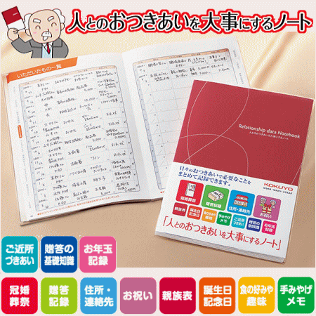 冠婚葬祭や贈答の記録、親戚や友人知人との日常的なつきあいなど、日々のおつきあいに必要なことを一冊にまとめて記録できるノート 日々のこまごまとしたおつきあいの情報を一冊にまとめることができ、冠婚葬祭や親戚付き合い、また友人やご近所とのおつき合いにも役立ちます。 |