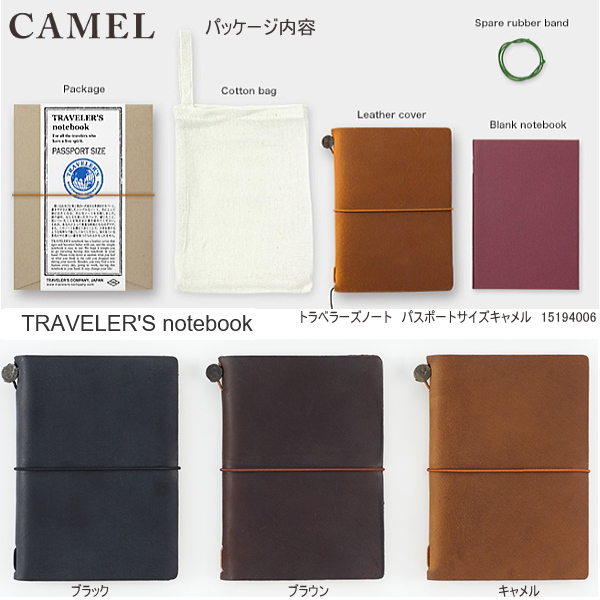 トラベラーズノートパスポートサイズのスターターキットです。牛革製の本体と無罫ノート、コットンケース、スペアゴムバンド(色違い)がセットされています。