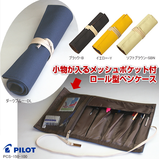 飛び出さないロールタイプのペンケース。小物が入るめしゅポケット付で便利。